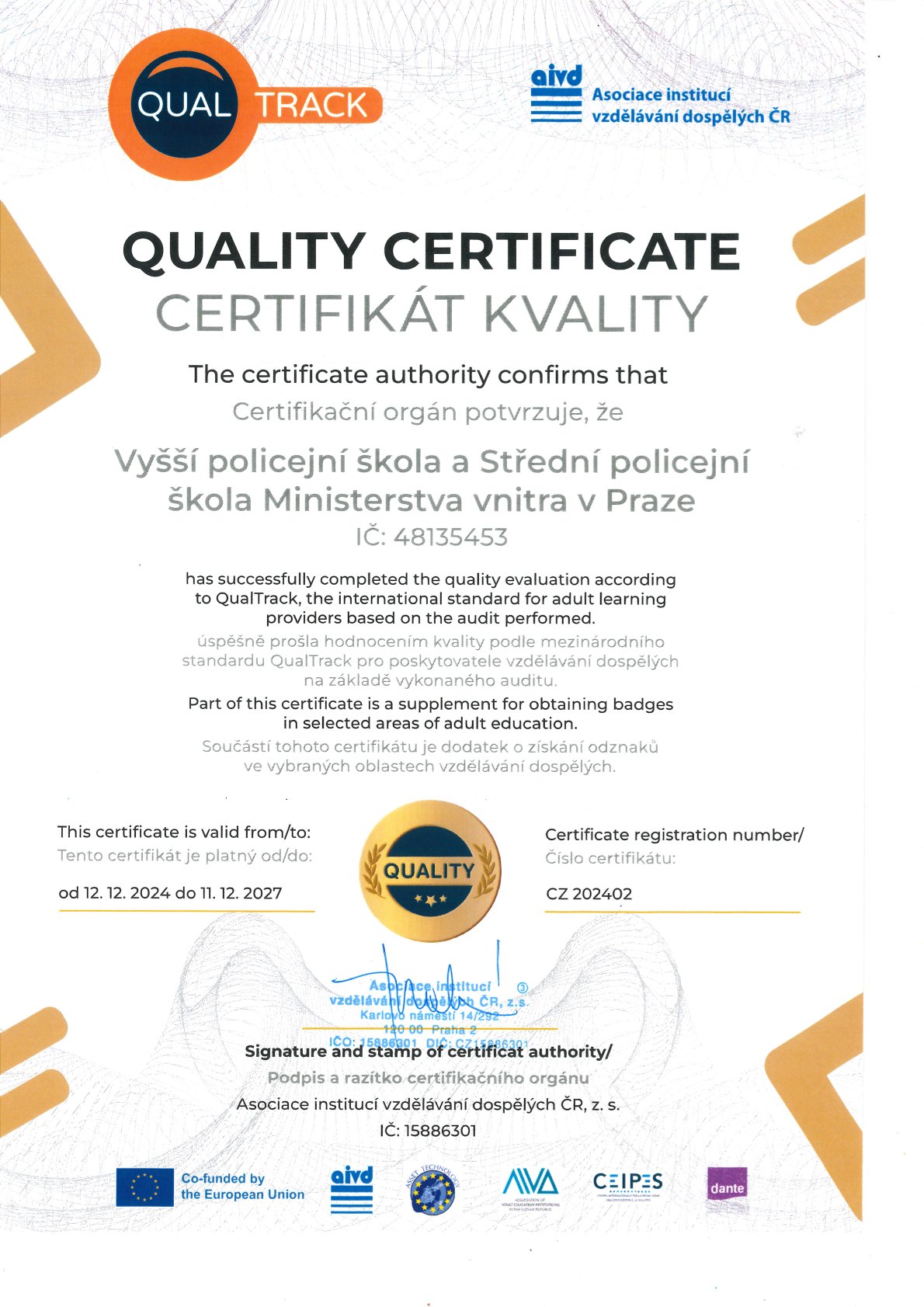 VPŠ a SPŠ MV v Praze získala prestižní mezinárodní certifikát kvality ve vzdělávání dospělých QualTrack. Projekt QualTrack, realizovaný partnerstvím pěti organizací z různých zemí EU (ČR, Itálie, Chorvatsko, Řecko a Slovensko), si klade za cíl navrhnout nový systém hodnocení kvality vzdělávacích institucí. Tento systém umožňuje nejen rozvíjet prvky kvality vzdělávací instituce, ale také propagovat instituci na základě značky kvality a poskytovat zákazníkům jasné informace o kvalitě.